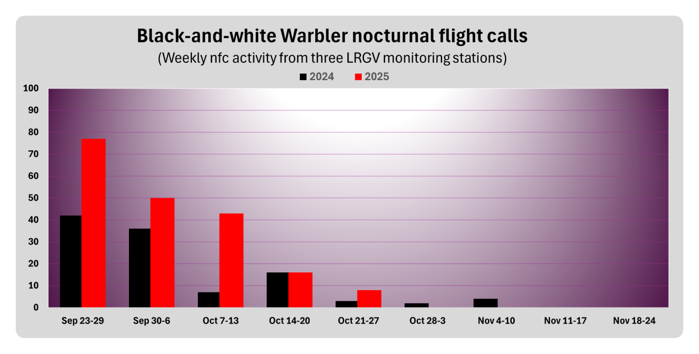 Weekly Black-and-white Warbler (BAWW) night flight call activity automatically detected by Nighthawk software operating 8 hours per night (9p-5a CDT, GMT -5) in 2024 and from half-an-hour after sunset to 90 minutes before sunrise in 2025. Nfc activity is the sum of all incidences of a correctly ID'd BAWW detection that occurred at least one minute from another BAWW detection (see Evans & Conway 2021). Data updated weekly.
