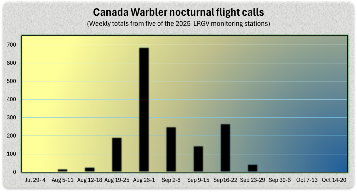 Weekly Canada Warbler night flight call (nfc) activity automatically detected by Nighthawk (3.1) software operating at five stations in the LRGV acoustic monitoring transect. Nfc activity is the sum of all incidences of a correctly ID'd CAWA detection that occurred at least one minute from another CAWA detection (see Evans & Conway 2021). Data updated weekly.
