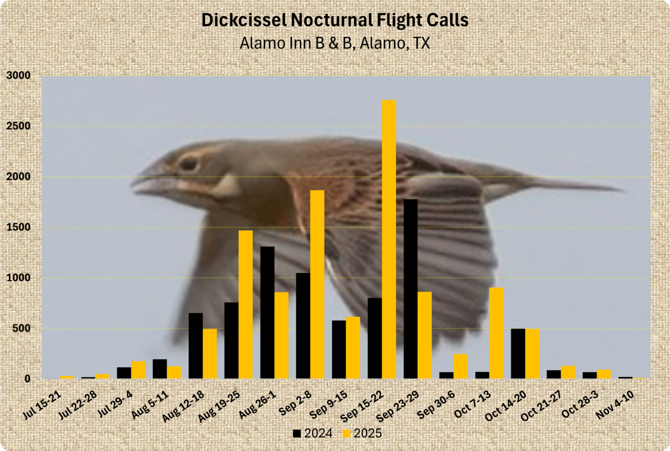 Weekly Dickcissel (DICK) night flight call (nfc) totals automatically detected by Nighthawk software. Call monitoring in in 2024 occurred from 9pm-5am. In 2025 it occurred from half an hour after sunset to 90 minutes before sunrise. So, 2024 data involve a consistent 8-hour sample of the night and 2025 involves a consistent time frame relative to sunset and sunrise. For example on July 15, 8 hours and 23 minutes of the night was sampled; on August 15, 8 hours and 58 minutes of the night was sampled; on September 15, 9 hours and 42 minutes of the night was sampled; and on October 15 the nightly sample is 10 hours and 28 minutes. So, 2025 sampled a larger duration of night than 2024 and it increased as the season progressed. Therefore more DICK calls per night/week was likely in 2025. At the end of the season, the data will be converted to percent of total calls per week, which will help provide a better comparison between years.