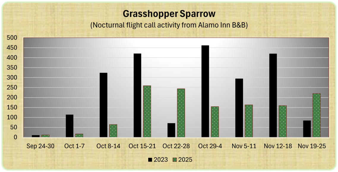 Grasshopper Sparrow nocturnal flight call (nfc) activity at Alamo Inn B&B automatically detected by Nighthawk 0.3.0 software. Call monitoring in 2023 occurred from 9pm-5am. In 2025 it occurred from half an hour after sunset to 90 minutes before sunrise. So, 2023 data involve a consistent 8-hour sample of the night and 2025 involves a consistent time frame relative to sunset and sunrise. For example on September 24, 9 hours and 56 minutes of the night was sampled and on October 15 the nightly sample was 10 hours and 28 minutes. W. Evans checked whether automatic detections were correctly identified and removed false positives. Nfc activity is the sum of all incidences of a GRSP detection that occurred at least one minute from another GRSP detection. In other words, calls occurring within one minute were tallied as one.